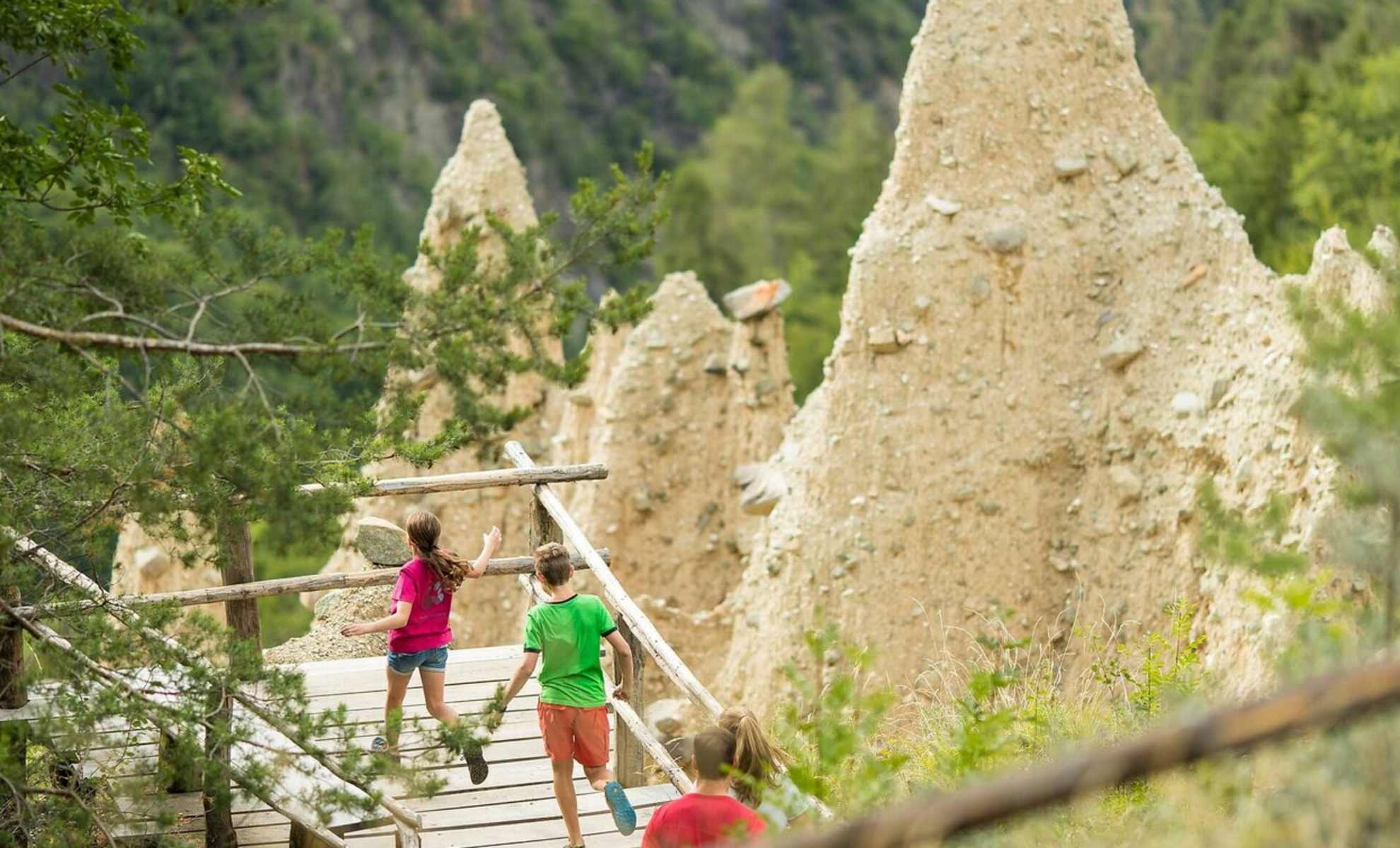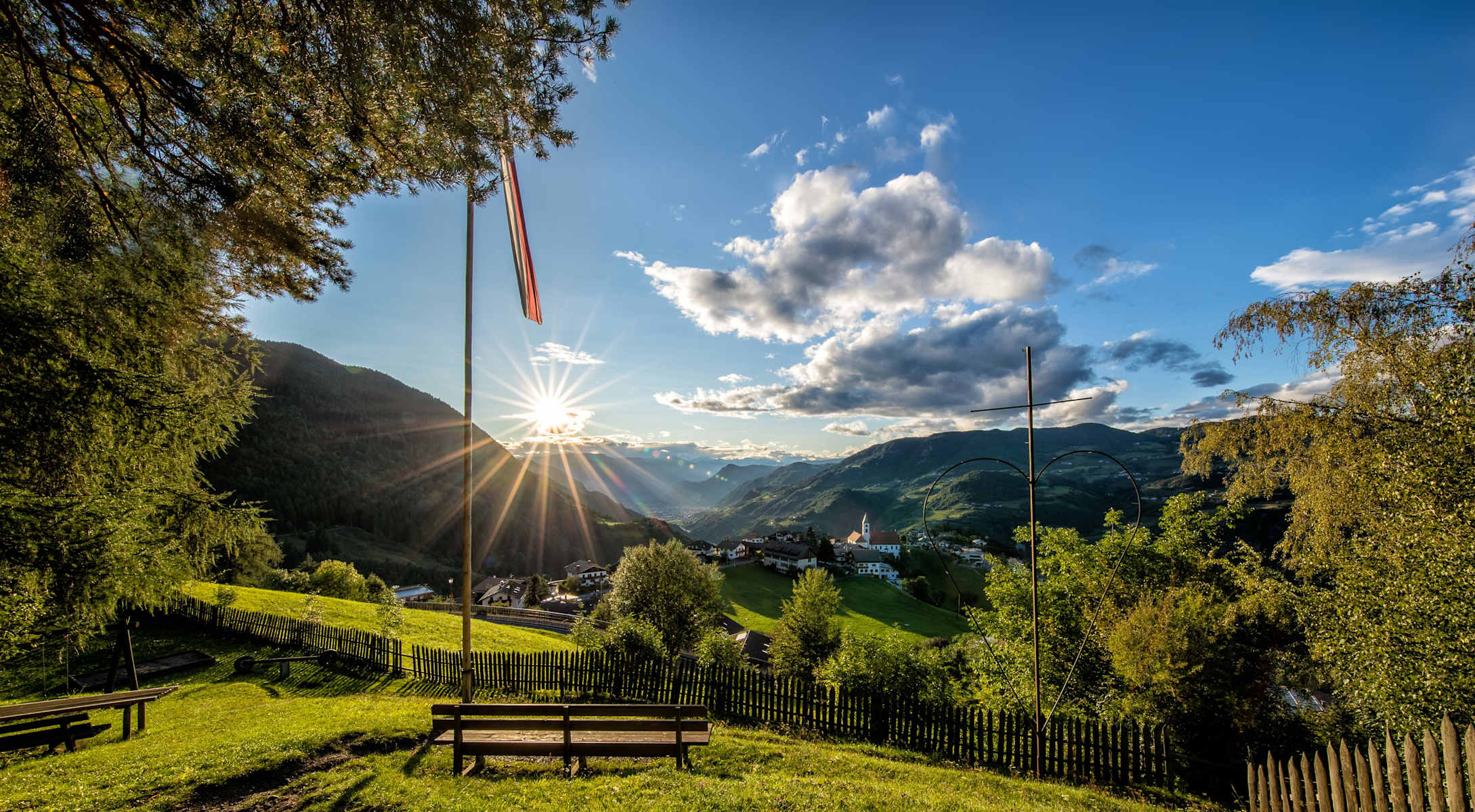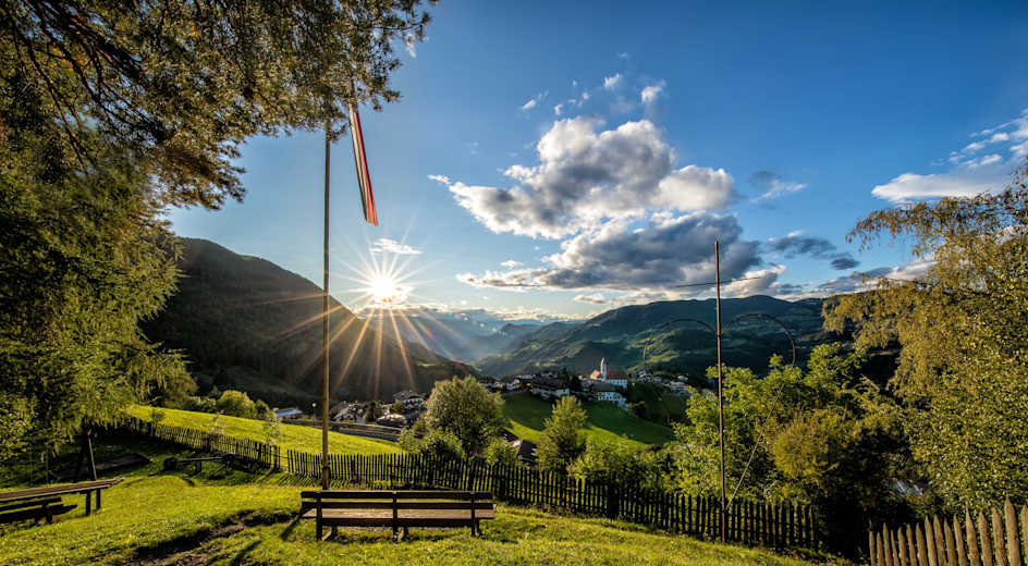 Weiter geht es über den Weg 2B vorbei am Cafè Christl und beim Hotel Oberwirt links weg. Dieser Weg führt über den Hügel „Pstosser Bühl“ mit seiner Freiluftausstellung, einem Mountain-Cinema und tollen Ausblicken auf den Schlern und den Rosengarten. Am Ende des Weges 2B befindet sich eine kleine Kapelle „Zum Weißen Bild“. Hier biegst du links weg auf den Weg 2. So kommst du an den Erdpyramiden von Steinegg vorbei und folgst diesem Weg absteigend vorbei am Dosser Hof, Heigler Hof, Oberparnai Hof bis ins Tierser Tal nach Breien. Weiter geht es immer über den Weg 2 entlang des Breibaches bis unterhalb der Ortschaft Tiers.