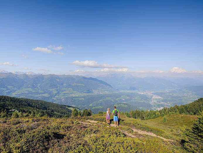 Die Wanderung auf das Astjoch nimmt auf dem Parkplatz Kreuzner (gebührenpflichtig) oberhalb des Weilers Ellen ihren Anfang. Unterhalb des Parkplatzes zweigt der gut markierte Waldweg Nr. 67 in Richtung Astjoch ab. Er führt im angenehmen Anstieg nach etwa einer Stunde zur etwas verborgen gelegenen Walderalm, die im Frühsommer von blühenden Wiesen umgeben ist und die dich von Juni bis September zur genüsslichen Zwischenrast mit Blick auf den Brunecker Talkessel einlädt. Hinter der Walderalm schlängelt sich der Weg zur nahen Waldgrenze weiter und steigt dann sanft durch aussichtsreiche Wiesen- und Heidenhänge bis zum Astjoch an. Beim hohen Gipfelkreuz genießt du einen atemberaubenden Rundblick auf das Pustertal, die Zillertaler Alpen, das Eisacktal und die Dolomiten. Ein Panoramapunkt zeigt die Namen einiger der ringsum aufragenden Bergspitzen an.