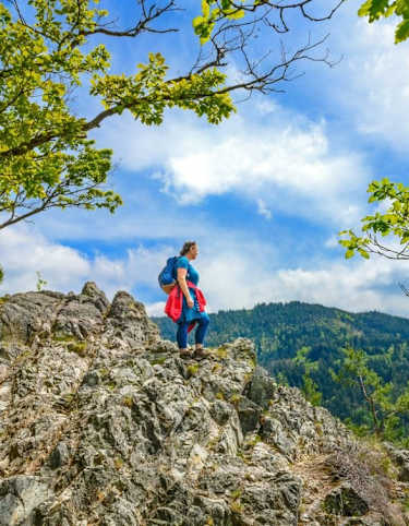 Vorbei am Rappenschrofen ist unser nächstes Ziel der Hexentanzplatz. Der Weg führt uns weiter zum Katzenschrofen, einer Felsformation, die Trittfestigkeit verlangt. Über einen steil abwärts angelegten Pfad erreichen wir den Grillplatz/Blaubronn. Ab hier folgt ein kurzes asphaltiertes Wegstück mit schönen Ausblicken, ehe wir bergan erneut den Wald betreten.