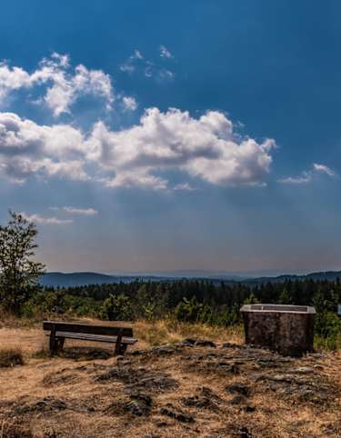 Weiter stetig bergan haben wir die Möglichkeit, eine Schleife zum Getränkebrunnen beim Ferienhof Benz zu machen und dabei die Aussicht auf der XXL-Bank zu genießen. Wir kommen automatisch auf den ursprünglichen Weg zurück, der schließlich in den Renchtalsteig mündet und uns zur Ringelbacher Buchwaldhütte führt.