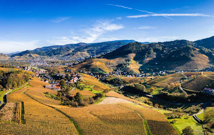 Am Bürstenstein genießen wir eine unglaubliche Weitsicht bis ins Elsass und zu den Vogesen, ehe wir uns weiter bergab, vorbei am Silberbrünnele über eine idyllische Viehweide zum Hexenbänkle mit Blick auf Furschenbach begeben. Über die Rebflurneuordnung Heidenhöfe und einen kleinen Baumlehrpfad gelangen wir zurück zum Ausgangspunkt Zuckerbergschloss.