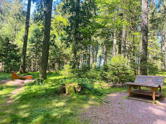 Vom Rathaus Schönwald geht es in den Keplerweg, weiter über den Josefsweg und den Steinweiher zur Halde. Am Waldrand bergauf gelangst du, immer den Genießerpfadschildern folgend, zur Adlersprungschanze. Nach den Jugendschanzen gehst du auf einem schmalen Pfad durch einen fast schon märchenhaften Wald zur Sonnenbadestation Auf der Höh. Hier laden Relax-Liegen zum Verweilen ein.