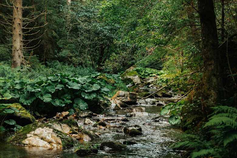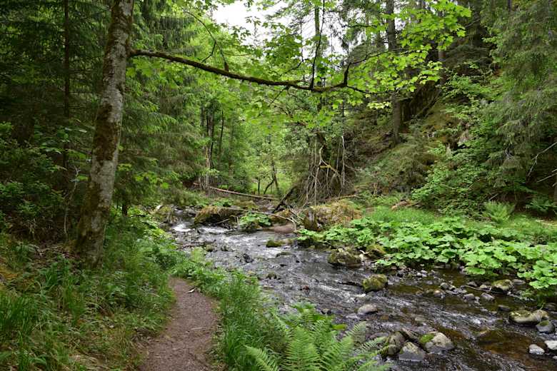 Parallel zur Haslach führt der Weg bis zur Mündung in die Wutach. Du folgst ein Stück der Wutach und steigst dann über die Steinfelder aus der Schlucht empor. Nun öffnet sich der Blick über die Weite des Gutachtals und den Verlauf der historischen Bahntrasse mit seinen imposanten Viadukten.