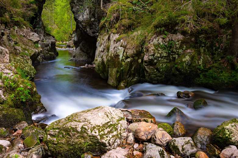 Über den Mühlenweg führt die Tour zur Schlucht hinab und über einen historischen Fuhrweg wieder kurz bergan. Du gehst weiter entlang einer stillgelegten Bahnstrecke und später wieder in die wild-romantische Schlucht hinunter. Auf engen Pfaden kommst du zum beeindruckenden Höllochfelsen.