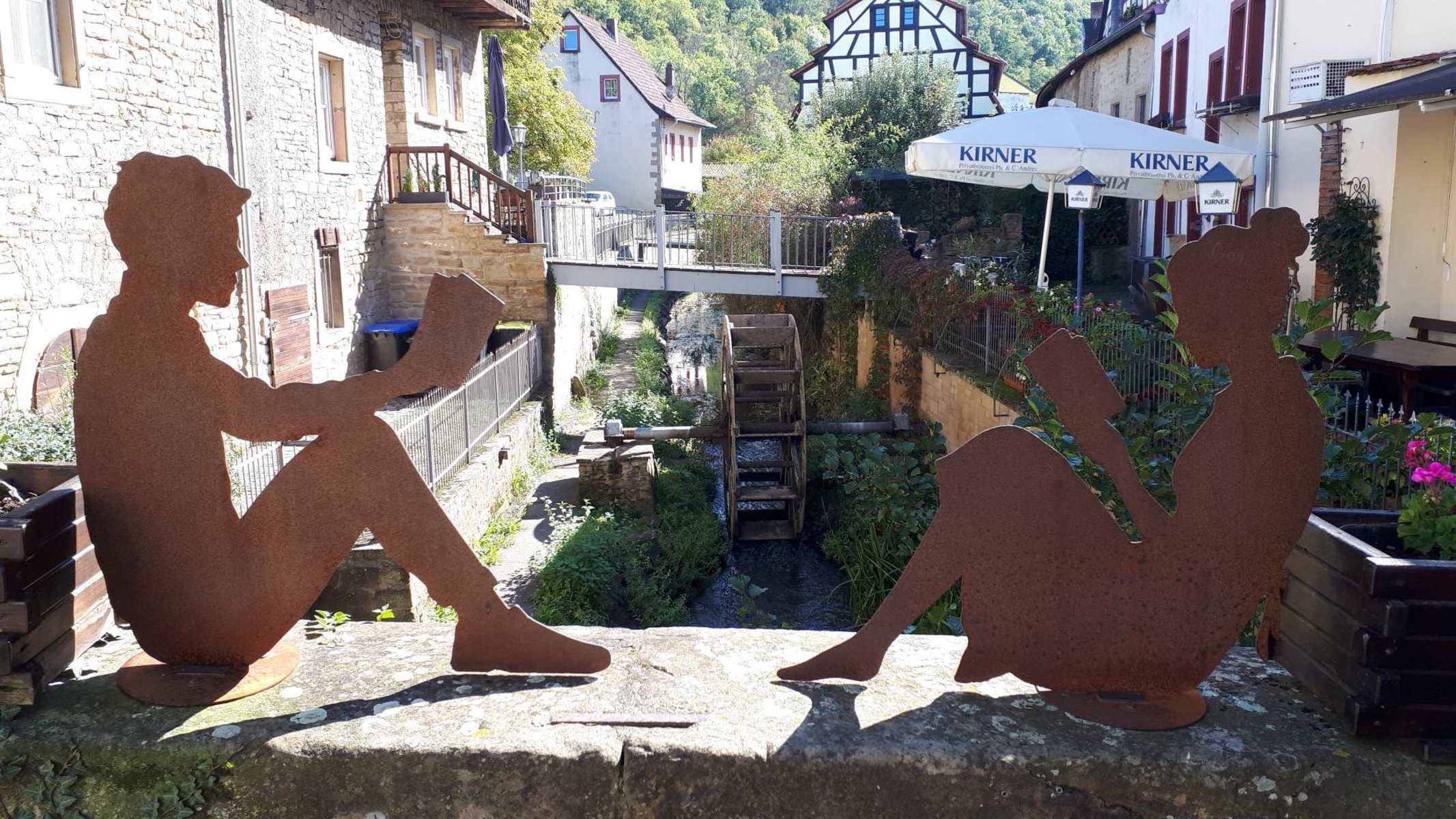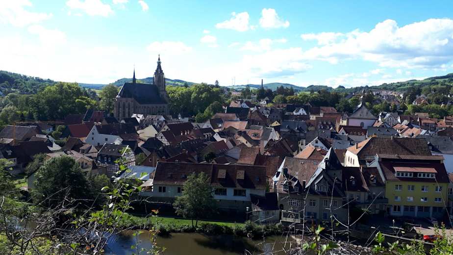 Auf idyllischen Forstwegen steigen wir durch den dichten Wald nun bergab, bis wir über eine schmale Treppe das pittoreske Stadtzentrum von Lauterecken erreichen.
