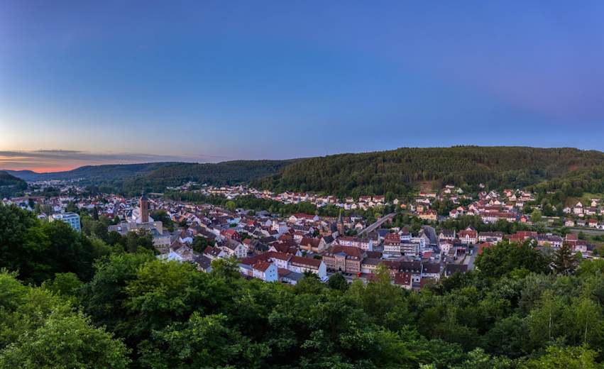 Von der Terrasse des Hilschberghauses (PWV) (Öffnungszeiten: Mo–Sa ab 12:00 Uhr, an Sonn- und Feiertagen ab 10:00 Uhr) werfen wir einen letzten Blick über die Stadt Rodalben, bevor wir in mehreren Bögen oberhalb der Stadt am Hang entlang wandern und schließlich ins Tal der Rodalbe hinabsteigen.
