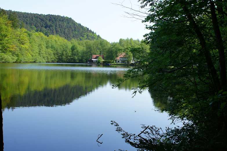 Nach dem erfrischenden Bad im idyllischen Seehof-Weiher lohnt sich eine Rast im Waldgasthof St. Germanshof an der Grenze – mit regionaler Küche und einem herrlichen Ausblick ins Elsass, bevor es weiter Richtung Weintor und Wissembourg geht.