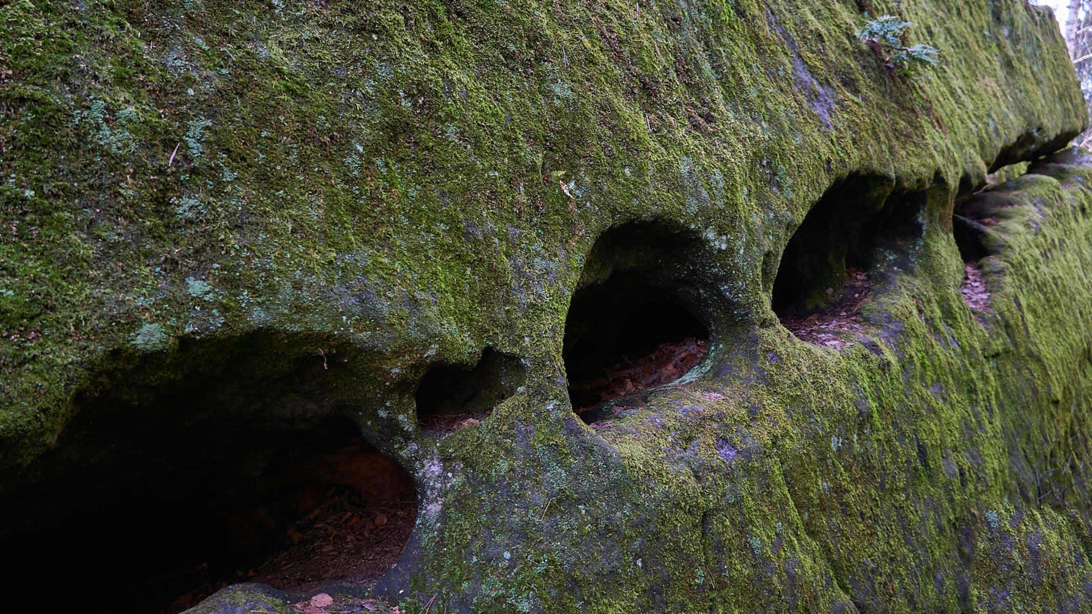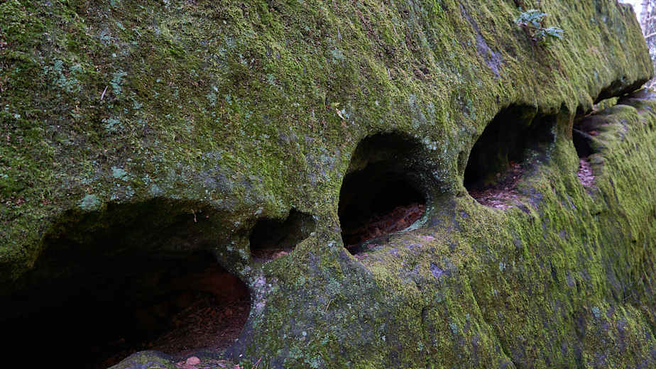 Felshungrige können hier einen Abstecher ins Kleine Labyrinth machen. Die Markierung gelber Strich führt bequem durch den Wald bis zu einer Straße. Auf der gegenüberliegenden Seite geht man weiter, verlässt nach ein paar Minuten den markierten Weg und folgt dem Wegweiser Napoleonstein.