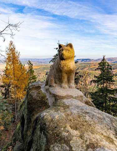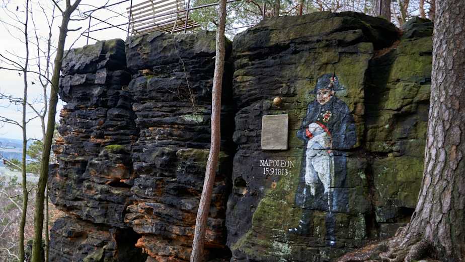 Von dieser Felskanzel hat man bei klarer Luft einen guten Fernblick ins Osterzgebirge. Napoleon soll wohl von diesem Stein am 15. September 1813 das Vorrücken seiner Truppen nach Böhmen befehligt haben. Wer ein bisschen sucht, findet nicht nur „Napoleon“, sondern auch eine goldene Kugel! Denn, so heißt es, Kaiser und Könige dürfen nur mit einer silbernen oder goldenen Kugel beschossen werden. Wer die Kugel findet, sollte sie auch zart berühren, denn sie soll Glück bringen – schließlich hat sie auch Napoleon verschont.