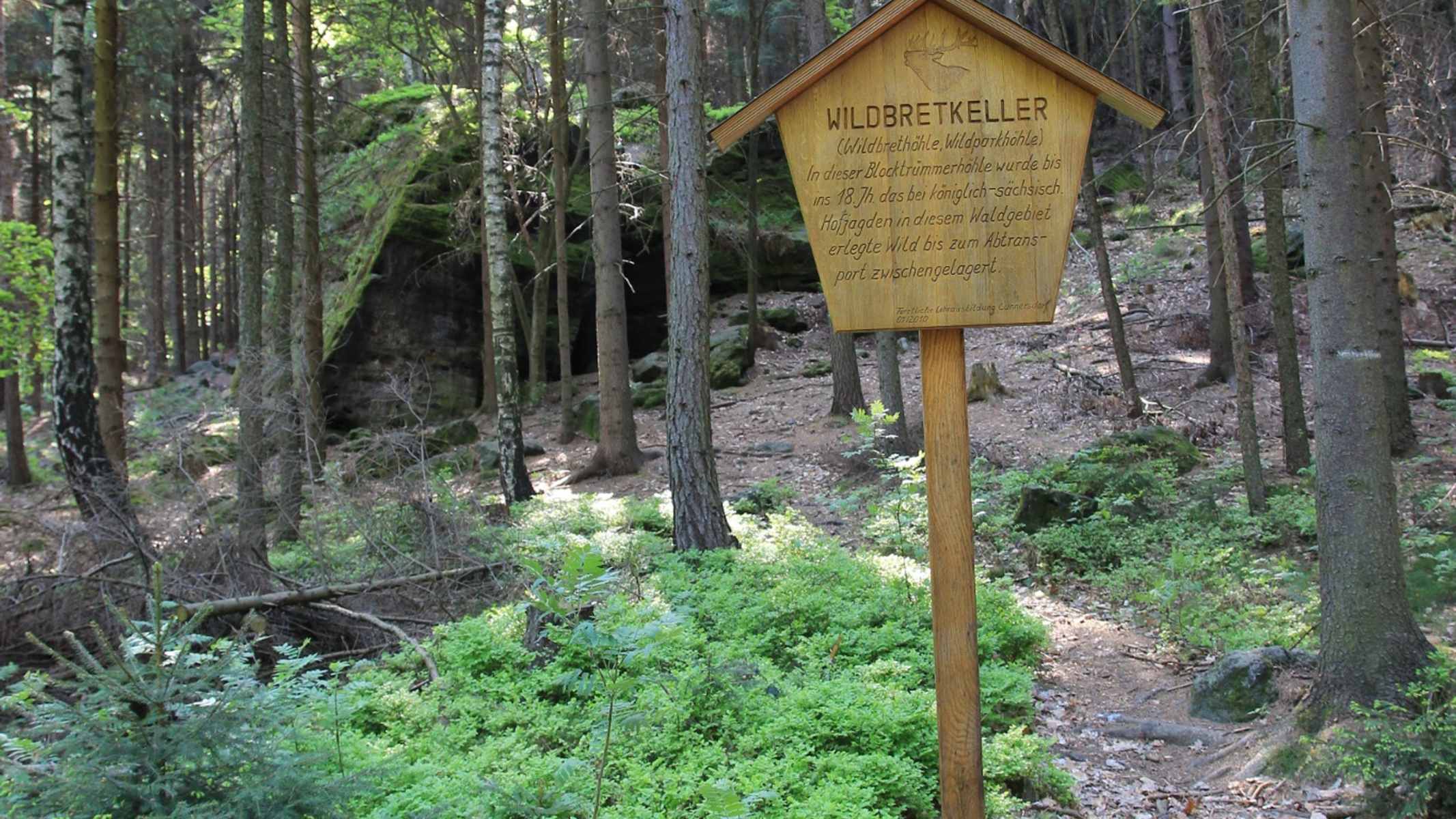 Bergab führt ebenfalls der rote Punkt vorbei an der Wildbrethöhle. Am sogenannten Flügel B, der auch die Markierung grüner und gelber Punkt hat, wandert man rechterhand weiter. Im Sattel zwischen Kleinem und Großem Zschirnstein folgt man dem Wegweiser zum Kleinen Zschirnstein und wandert auf dem gelben Punkt zu den Aussichtspunkten an der nördlichen Felskante. Der Rundweg führt wieder zurück in den Sattel zwischen den beiden Tafelbergen.