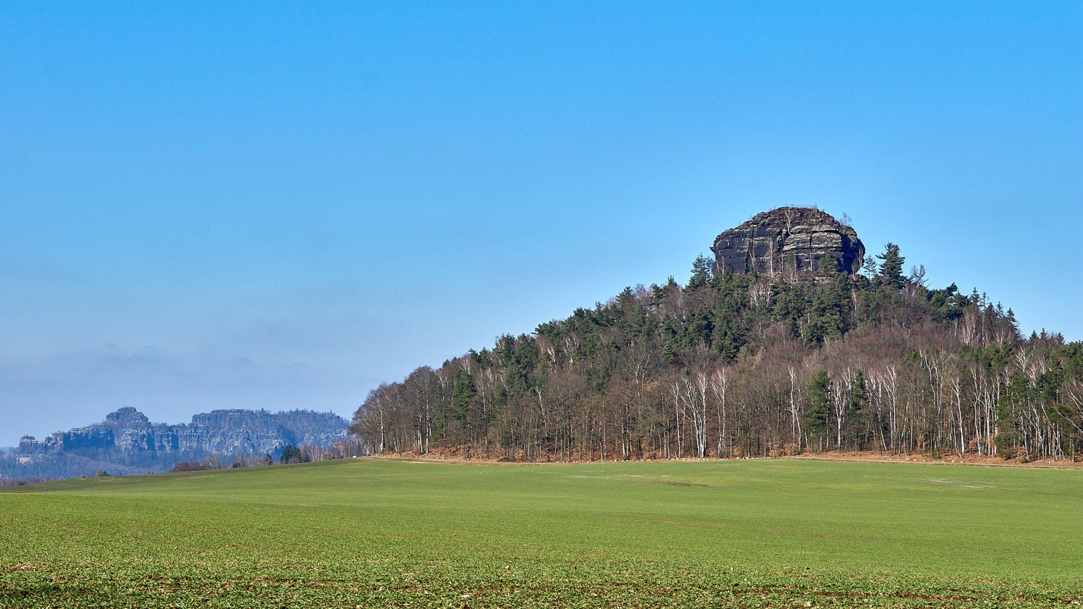 Hier geht man die Waldbadstraße rechts weiter und kommt so auf einen mit gelbem Strich markierten Wanderweg, der immer an der Waldkante entlangführt. Von weitem sieht man bereits den kleinen schlanken Zirkelstein, der als letzter hochgelegener Punkt der Tour wartet. Vom Plateau blickt man auf die Sandsteinformationen auf der anderen Elbseite, den buchenbestandenen Winterberg und das Prebischtor hinter der tief eingeschnittenen Elbe.
