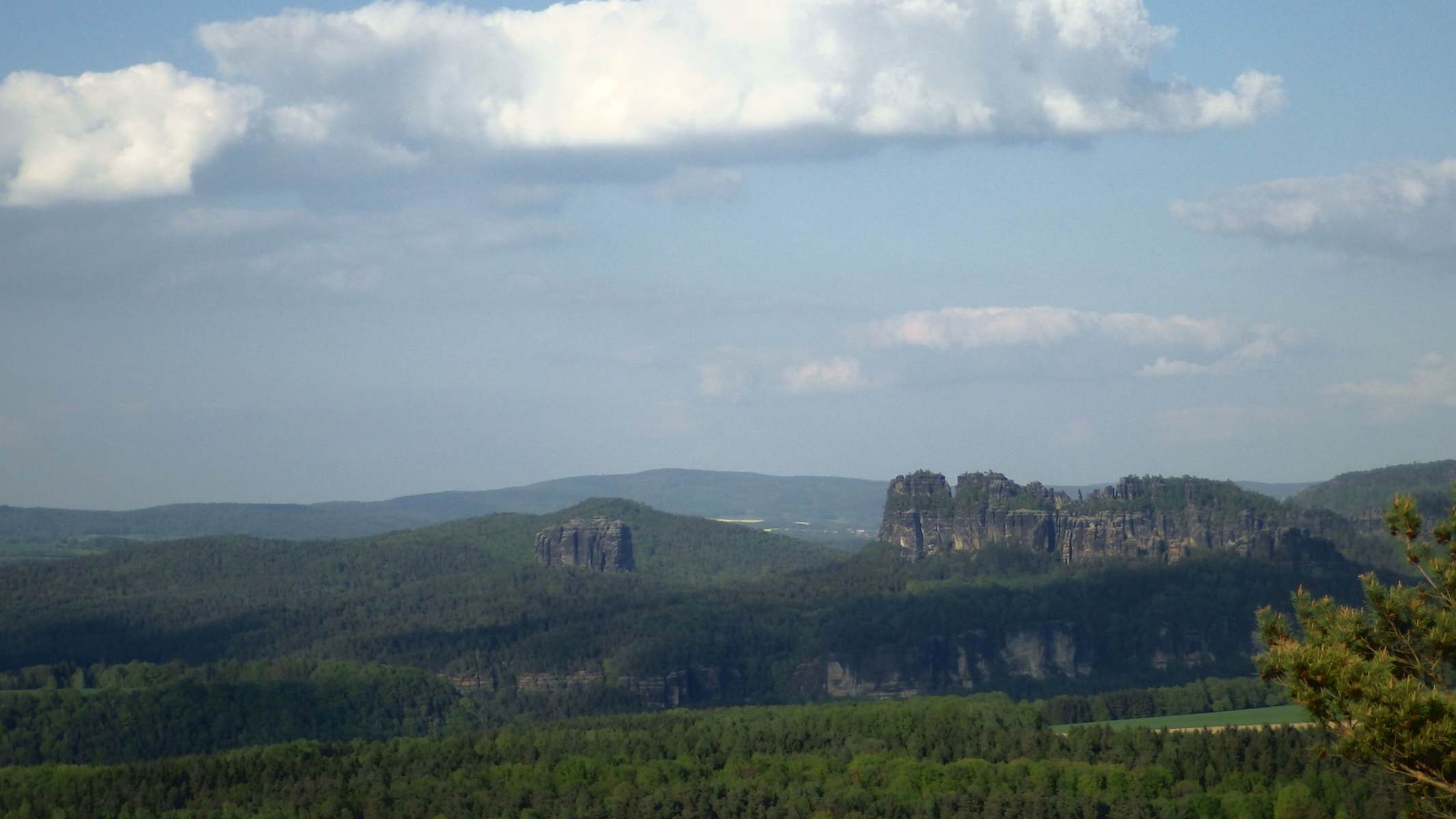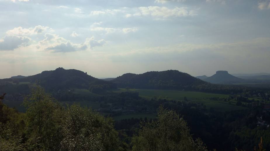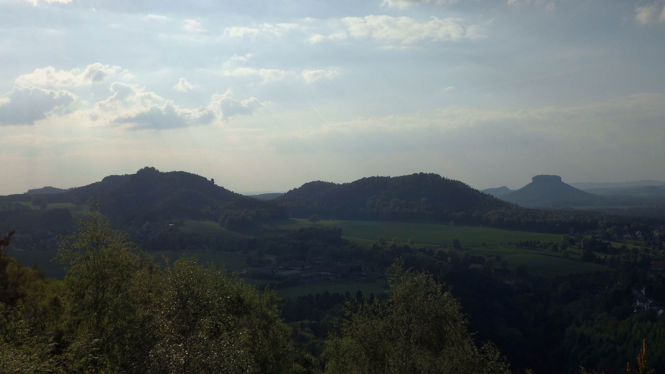 Nach wenigen Minuten erreicht man die wunderbare Aussicht auf 372 Höhenmetern: Der Blick reicht ins Tal nach Krippen, zur Elbe und nach Postelwitz, dahinter die Ortschaften Ostrau, Altendorf und Mittelndorf. Im Hintergrund erhebt sich der Unger. Rechts sieht man die Schrammsteine, den Großen Winterberg und den in Böhmen liegenden Rosenberg. Es schließen sich Reinhardtsdorf, Schöna mit Zirkelstein und Kaiserkrone an. Nach links reicht der Blick zum Papststein mit den Hunskirchen, zum Kleinhennersdorfer Stein und zum Lilienstein.
