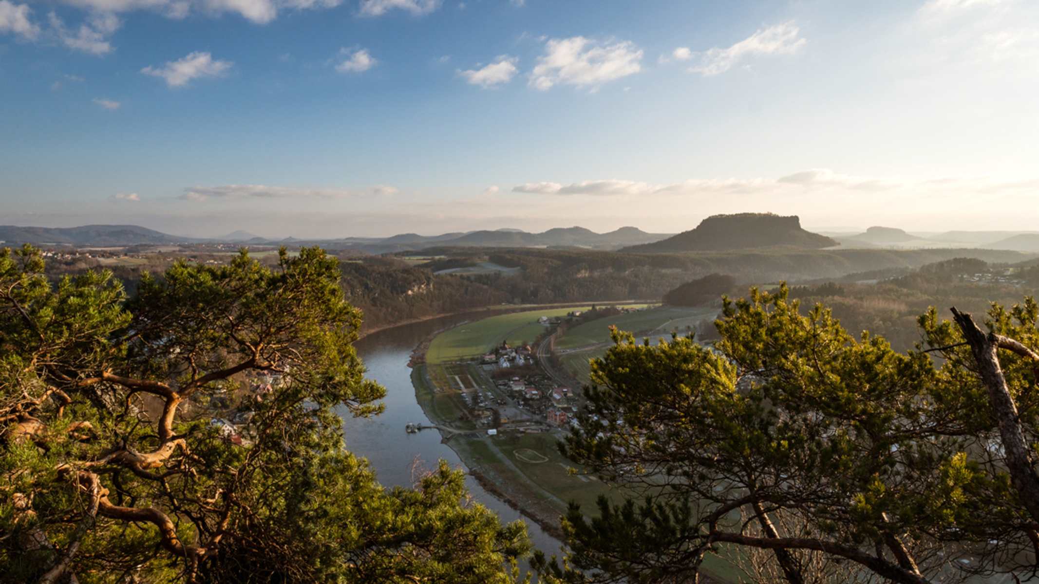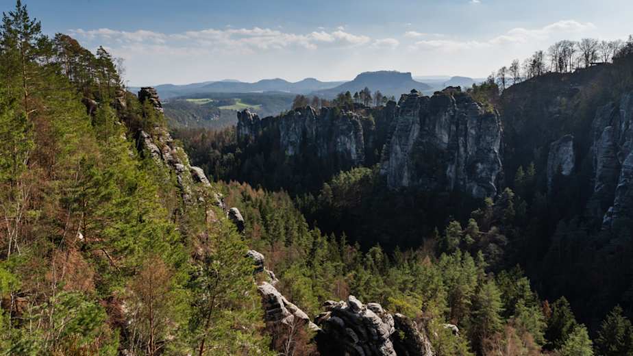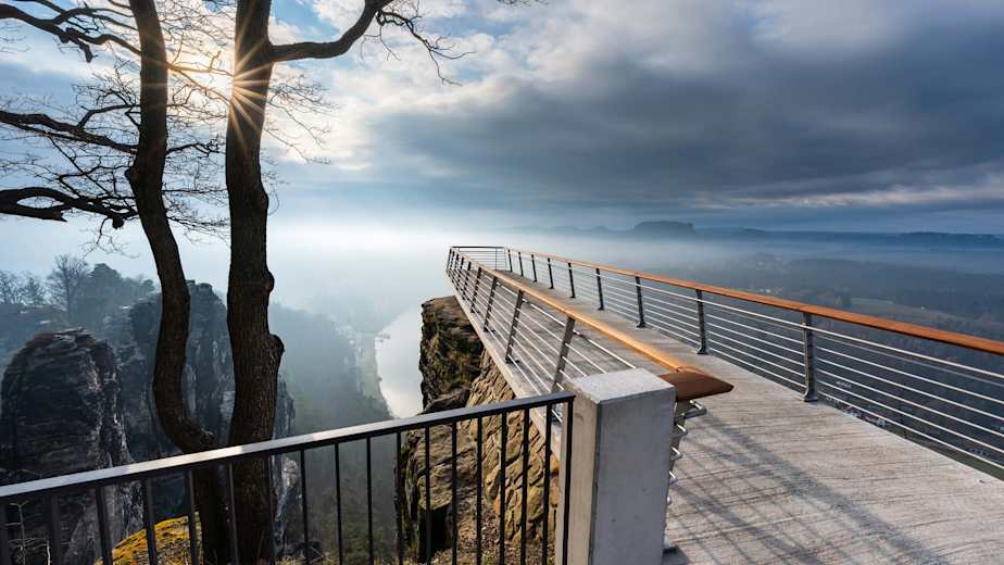 Direkt nach der Basteibrücke können Sie rechts zur Ferdinandaussicht gehen, bevor Sie links zur berühmten Bastei-Aussicht gelangen. Nach den 190 Metern Höhenunterschied belohnt Sie ein umfassender Rundblick: Zu Ihren Füßen die berühmten Sandsteinklippen und am Horizont die Tafelberge südlich der Elbe.