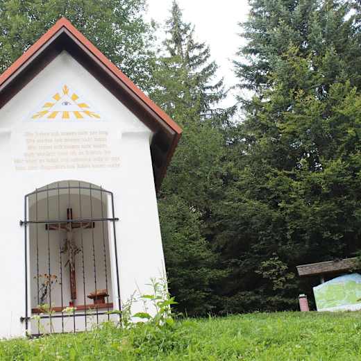 Bei Burgstall erreichen wir die Gemeindestraße, wir gehen durch den Ort und vorbei am Geigentaler Marterl. Nach ca. 300 Meter bergauf, biegen wir links in den Forstweg in Richtung "Arztal/Burgstaller Höhe" ein. Nach ca. 500 Metern halten wir uns rechts und gehen im Wald in Richtung "Jägerkreuz" weiter. Vorbei am "Jägerkreuz" führt der Weg hinauf auf zum Gipfelkreuz der "Burgstaller Höhe".