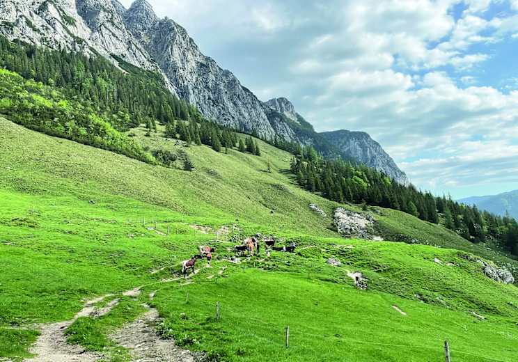 Die Rundwanderung zur Halsalm (ca. 1.200 m) hoch über dem Hintersee in den Berchtesgadener Alpen führt in rund 2,5 bis 3 Stunden auf aussichtsreiche Almwiesen mit Blick auf die Grundübelhörner und das Knittelhorn. Die Tour gilt als mittelschwere Wanderung und belohnt mit einer urigen, denkmalgeschützten Alm, die während der Weidesaison einfache Brotzeiten anbietet. Ausgangspunkt ist der Parkplatz Hirschbichlstraße nahe Ramsau, von wo aus es steil durch den Wald hinauf zur idyllisch gelegenen Alm geht.