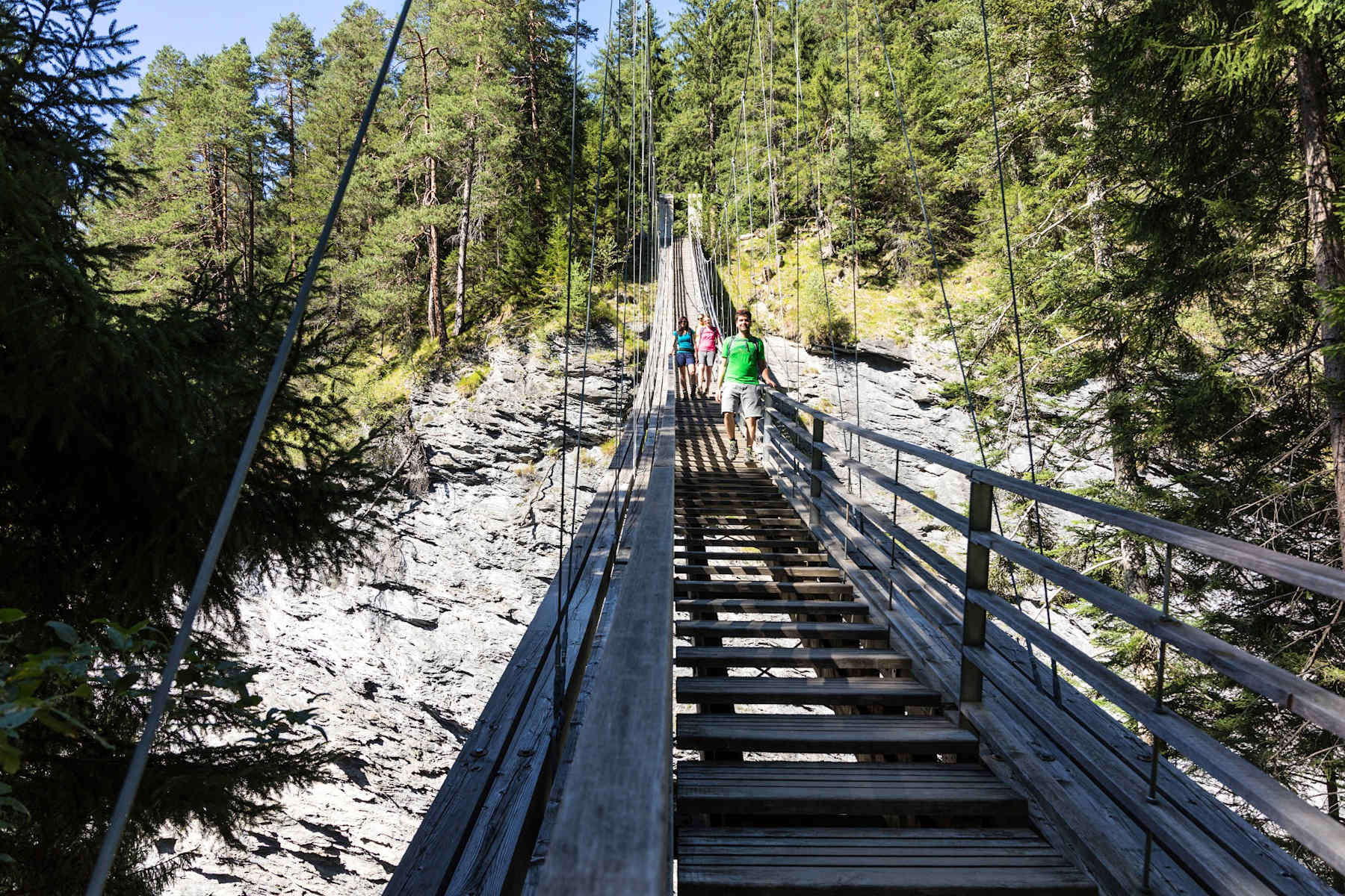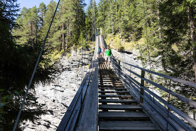 Von Hohen Rätien führt die Veia Traversina weiter zum Traversinersteg. Die spektakuläre, fast 60 m lange Holzhängebrücke, die zugleich eine Treppe bildet, ist einer der Höhepunkte auf dem Weg zum Besucherzentrum der Viamala-Schlucht. Der Traversinersteg überwindet eine Höhendifferenz von 22 m und liegt rund 70 m über dem Bachbett des Traversinertobels.