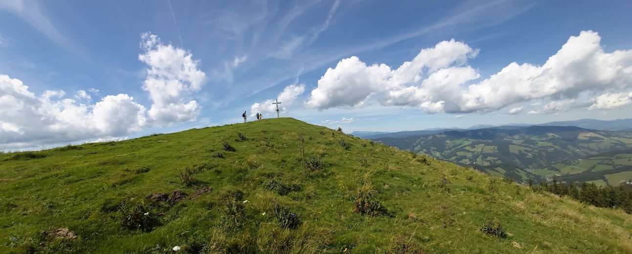 Wir überqueren Sommeralm-Straße und sehen dann auch gleich den Einstieg in den Wanderweg hinauf zum Windrad und weiter auf den Plankogel (bitte auf die Markierungen achten). Beim Plankogel-Gipfelkreuz haben wir den höchsten Punkt der Wanderung erreicht, der Ausblick hier ist dementsprechend grandios.