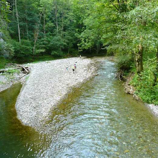Über den Steig geht es steil abfallend in die Große Raabklamm. In der Raabklamm angekommen, halten wir uns rechts und gehen flussaufwärts der Raab entlang bis nach Arzberg.