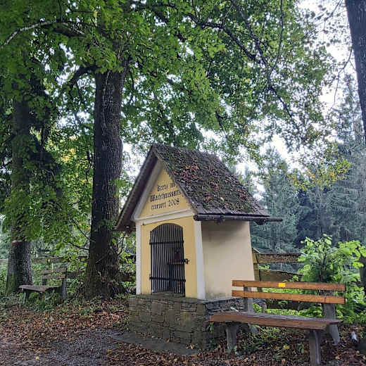 Der Weg ist jetzt durch den Wald und über Forststraßen hinauf zum "Wolfsattel" markiert. Noch vor dem Gipfel des Wolfsattels führt der Weg über Forststraßen in Richtung "Wachthaussattel". Bei der kleinen Kapelle am Wachthaussattel angekommen, ist es Zeit für eine kleine Rast.