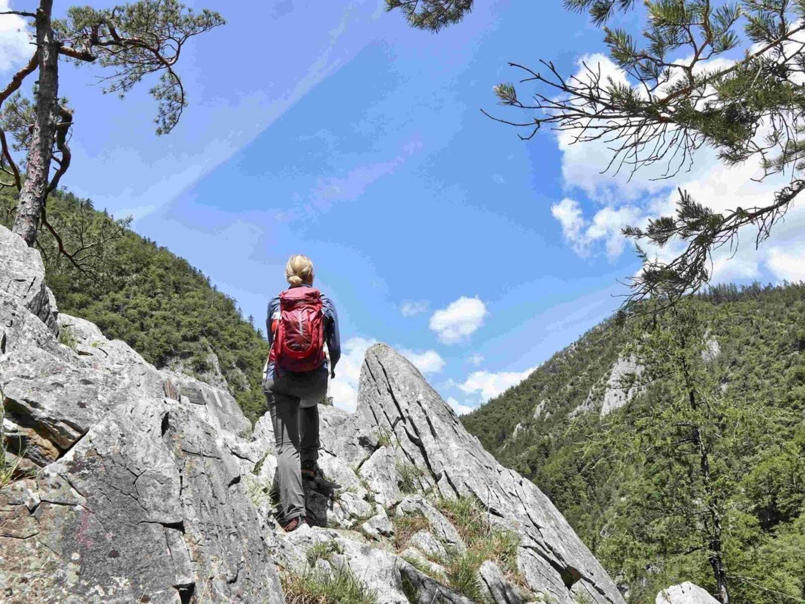 Der Einstieg in den Jägersteig ist ca. auf Höhe des Parkplatzes auf der anderen Straßenseite. Der Beginn des Steiges ist gleich etwas steiler, jedoch gut begehbar. Über eine Hängebrücke kommen wir zu einem großen Steinmandl, dort gehen wir rechts am Weg-Nr. 20 leicht bergab. Durch den Felsentunnel „Wagenhütte“ hindurch und weiter am Steig bis zum Parkplatz am Ende der Klamm.