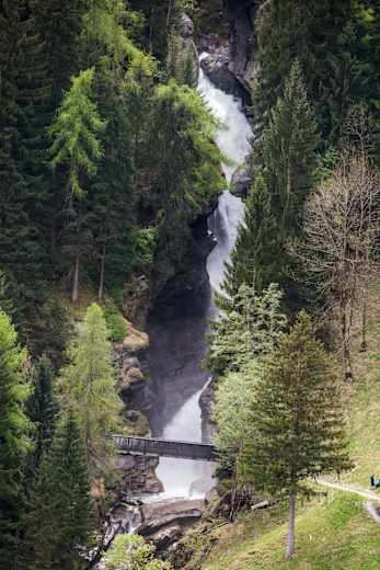In Moos bis zur Kirche und den Bürgersteig in Richtung Pfelders entlang bis über die erste Straßenbrücke. 50 m weiter geht links der Spazierweg bis zu den hölzernen Aussichtsbrücken über den Stieber Wasserfall ab. Von hier hat man einen atemberaubenden Blick auf den gigantischen Stieber Wasserfall, wo der Pfeldererbach zuerst 19 m und dann 18 m tief in die Passer stürzt.
