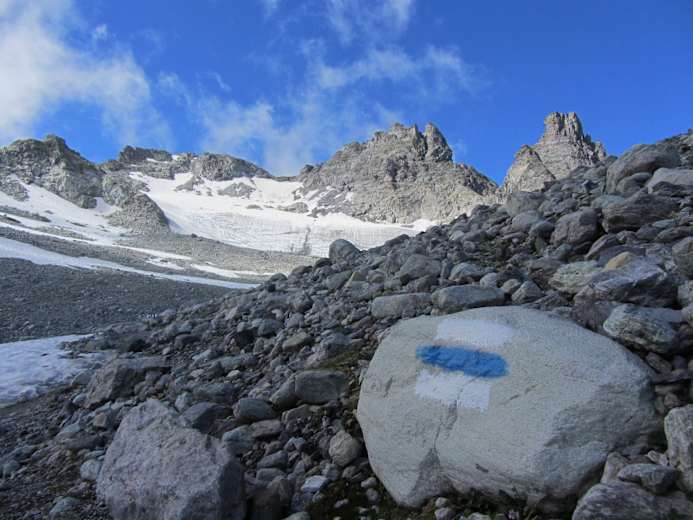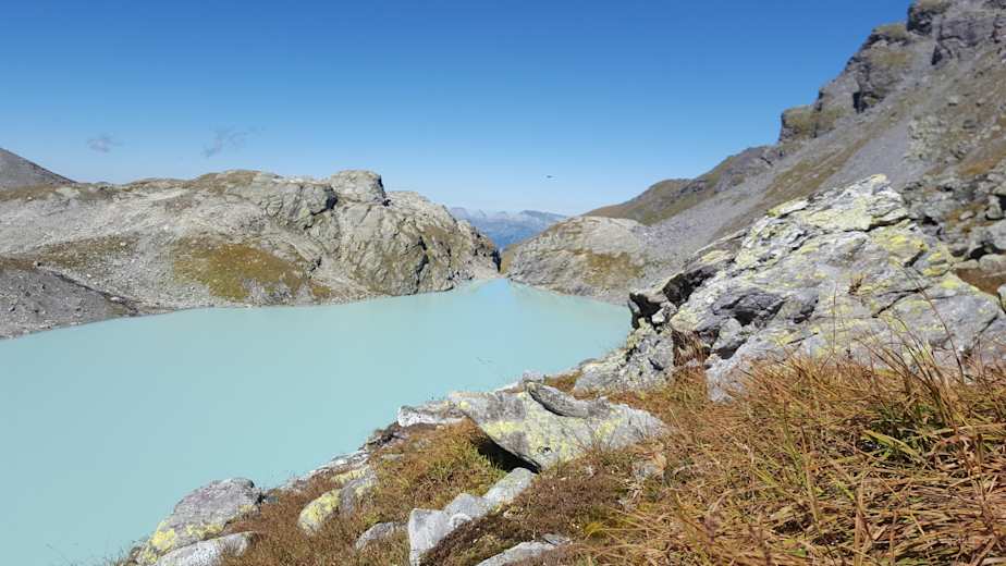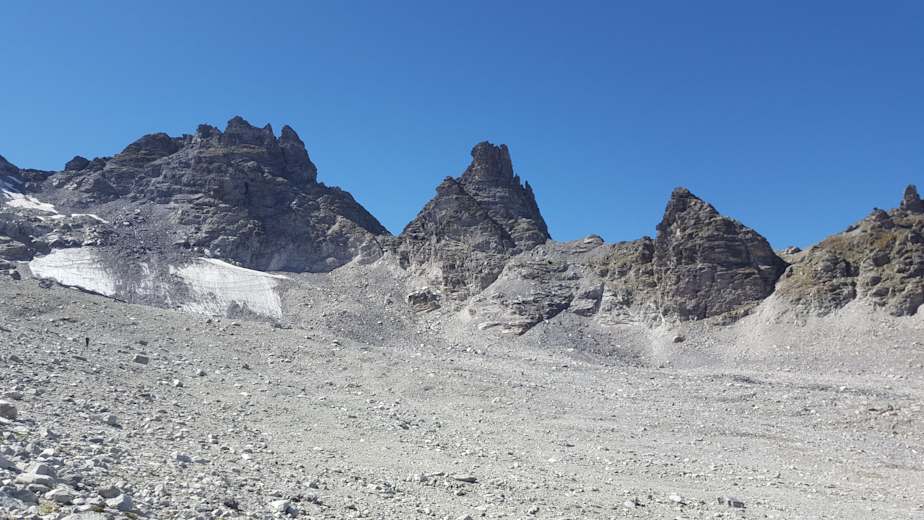 Auf der Wildseeluggen angekommen, eröffnet sich uns ein atemberaubender Blick auf den Wildsee und unsere zwei ersten Etappenziele – der Pizolgipfel hinter den Überresten des gleichnamigen Gletschers und der Hochwart zu seiner Rechten. Hier zweigen wir auf den weniger bewanderten Wanderweg links entlang des Wildsees ab. Weiter geht es über die Moränen des ehemaligen Gletschers in Richtung Pizolsattel. Der Aufstieg zu diesem wurde aus Sicherheitsgründen vom Pizolgletscher in den Felsen verlegt. An exponierten Stellen sind hier Stahlseile als Handlauf angebracht.