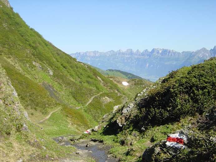 Weiter geht es nun in Richtung Wangsersee, vorbei an einem Alphüttli und weiter hoch über den Zickzackweg. Hier passierst du einige schmalere Stellen. Diese sind aber problemlos machbar und nach einigen Metern auch schon wieder vorbei. Danach gelangst du auf ein nächstes Plateau, welches dir nochmals einen genialen Blick zurück in Richtung Viltersersee bietet.