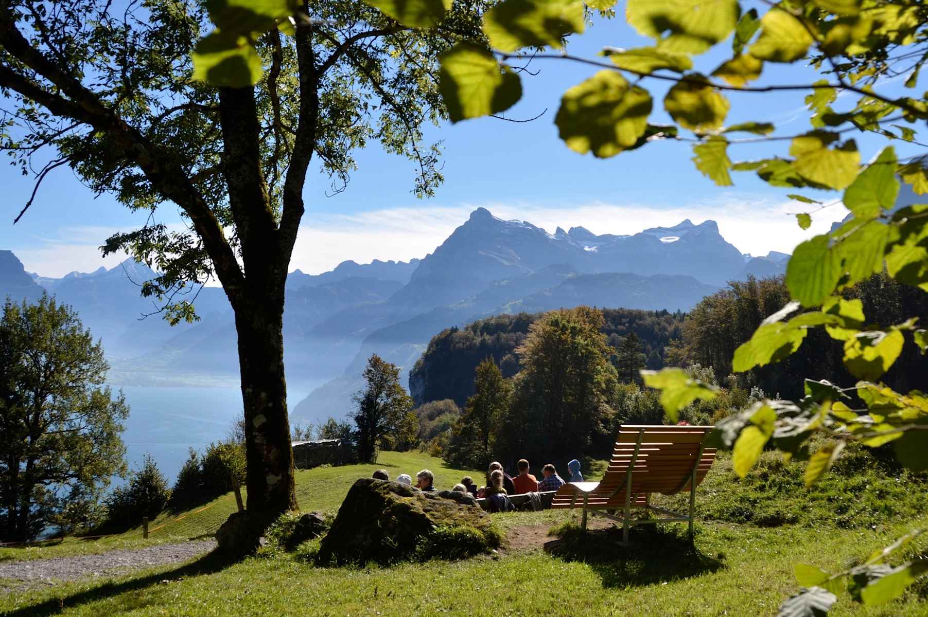 Seelisberg bietet vom Schillerbalkon und später von der Marienhöhe aus einen tollen Blick auf das Rütli, den Urnersee und die beiden Mythen.