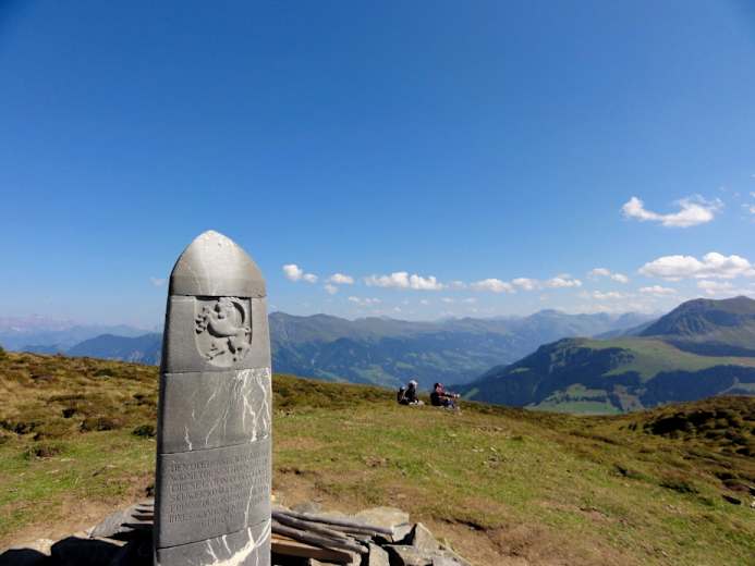 Der Dreibündenstein auf 2.160 m markiert den gemeinsamen Grenzpunkt der ehemaligen drei rätischen Bünde und erinnert als steinernes Denkmal an die Freiheitskämpfer Graubündens.
