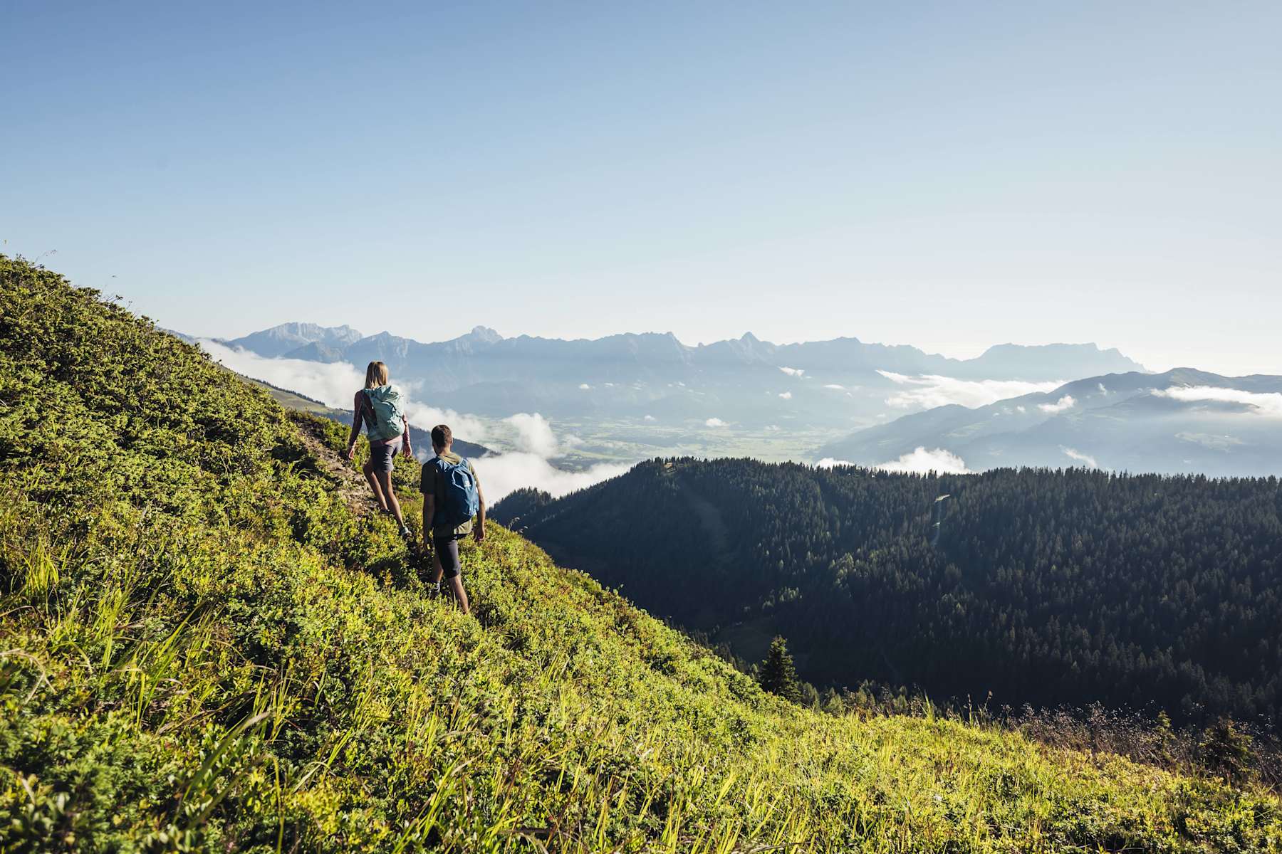 Von der Pinzgauer Hütte wandert man die Schotterstraße, zuerst abfallend und dann ansteigend nach Osten, bis zu einer Forststraßengabelung. Dann wandert man die links hinaufführende Straße (Ww. Schmittenhöhe/Ederhütte“), unter einem Sessellift hindurch an der Kettingalm vorbei, zur nahegelegenen bewirtschafteten Ederhütte. An dieser ebenfalls vorbei, aufwärts der Schotterstraße folgend. Bei der Links-Abzweigung geht man geradeaus, den Wiesenhang auf Steigspuren bis zum Kamm der Schmittenhöhe hinauf und auf diesem bis zum Gipfel der Schmittenhöhe (1.965 m) mit seiner Bergstation. Zwischen Kapelle und Restaurant geht man nun hindurch, dahinter rechts und gleich wieder links auf den „Sonnkogel-Erlebnisweg/Höhenpromenade“ und dann wandert man in weiterer Folge den Weg entlang des Kammes nach Norden, an der Hochzeller Alm vorbei, hinab. Anschließend auf der Höhenpromenade, rechts des Kammes, durch eine kleine Unterführung folgen und gleich dahinter links aufwärtssteigen, Richtung „Salersbachköpfl“ (1.934 m), den man über den Kamm erreicht. Genieße am „Hohe Tauern Panorama Trail“ die traumhaften Ausblicke auf die Nördlichen Kalkalpen, - vom Wilden Kaiser über die Loferer und Leoganger Steinberge, das Steinerne Meer und den Hochkönig bis hin zum Dachstein sowie bis weit in den Nationalpark Hohe Tauern hinein!
