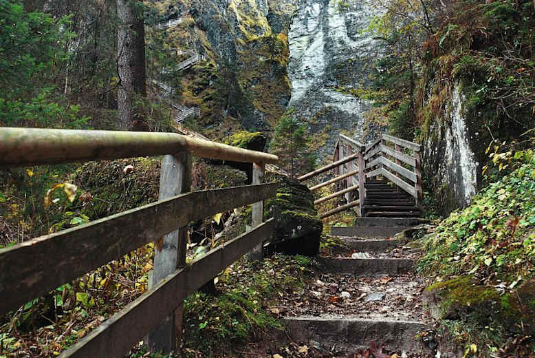 Dann passiert man den Eingang und folgt dem ungemein beeindruckenden aber sehr gut ausgebauten Steig aufwärts durch die gesamte Klamm bis zum Ausgang an ihrem oberen Ende (an der einzigen Gabelung hält man sich rechts). Die meisten Wanderer gehen von hier wieder zurück, hier folgt man jedoch weiter dem schönen Wanderweg oberhalb der hier viel milderen Schlucht bis nach einer Brücke der Wanderweg Nr. 4 „Embach“ links abzweigt und kurz steil hinauf zur Straße Richtung Embach führt.