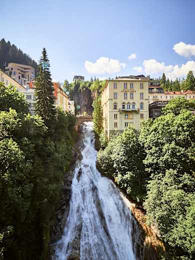 Der Start der letzten Etappe am Hohe Tauern Panorama Trail befindet sich an der Talstation der Stubnerkogelbahn. Rechts an den Kassen vorbei führt ein Durchgang zu einem gläsernen Übergang über die Hauptstraße durch Bad Gastein. Auf der anderen Seite links hinab zur Hauptstraße und vor der Shell Tankstelle schräg rechts in die Grillparzerstraße. Vor dem Hotel Salzburger Hof biegt man links hinab auf den Weg und wandert links am Hotel wie auch an der berühmten Bar „Silverbullet“ vorbei. Gegenüber des Hotels Eden Rock biegt man scharf rechts auf einen Weg ab, der hinab ins historische Ortszentrum von Bad Gastein führt. Hier überquert man nun den Kongressplatz wie auch den spektakulären Wasserfall mittels einer Brücke und hält sich nun leicht links haltend bis zur Preimskirche.