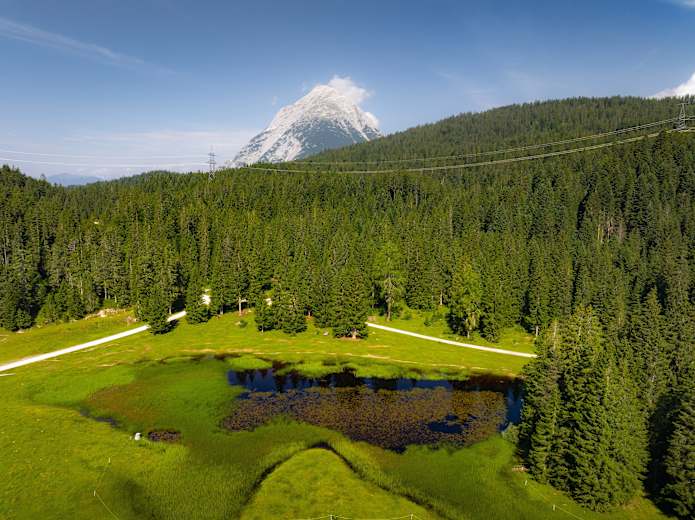 - Gewässer bei Wildmoosalm im Sommer - Drohnenaufnahme Richtung Hohe Munde - Foto: Region Seefeld  - Sonnenaufgang Aussichtsplattform Bruschkopf - Drohnenaufnahme - Plattform im Morgen licht - Blick zur Hohen Munde - Foto: Region Seefeld  - Wildmoosalm im Sommer - Drohnenaufnahme Richtung Wald - Foto: Region Seefeld  - Friedensglocke Mösern zur Sonnenuntergangsstimmung im Frühling - Drohnenaufnahme Paar am Weg zur Glocke - Foto: Region Seefeld - Bildergalerie (4)