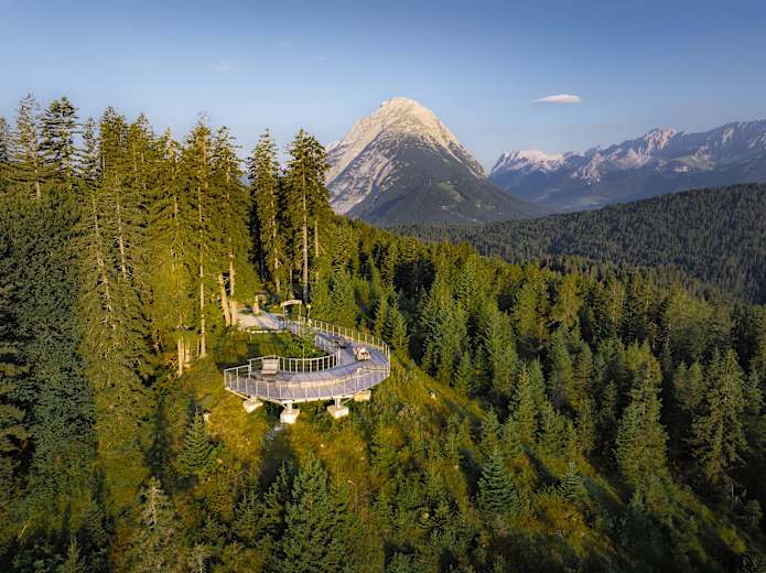 An der zweiten Weggabelung rechts der Beschilderung Brunschkopf/Wildmoosalm/Seefeld folgen und bei der nächsten Möglichkeit links auf den Wandersteig (Weg Nr. 61 Brunschkopf) abbiegen. Diesem Steig nun immer weiter folgen – wo die Forststraße den Steig kreuzt, bitte besonders auf Biker achten. Am Aussichts- und Fotospot Hohe Munde empfiehlt sich außerdem ein schönes Erinnerungsfoto. Wenig weiter hat man auch schon die Aussichtsplattform Brunschkopf erreicht. Das atemberaubende Bergpanorama lässt sich hier mithilfe eines hochkarätigen Swarovski-Fernglases übrigens besonders kristallklar genießen.