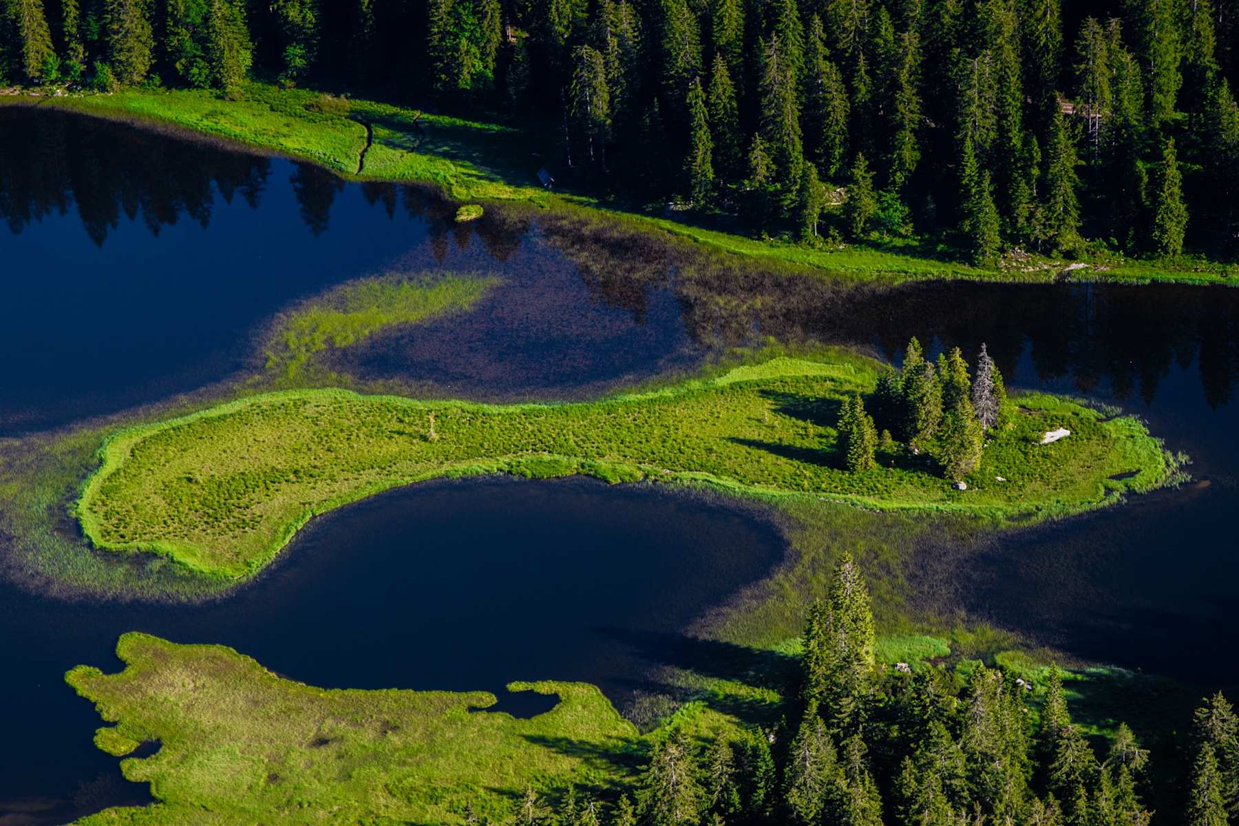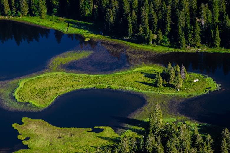 Der Abstieg führt zuerst durch üppige Latschenfelder, später über die saftigen Almwiesen der Herrenalm (vorübergehend geschlossen) hinunter zum Leonhardikreuz. Dort verlassen Sie das Almgebiet und steigen in den idyllischen Waldkessel des Obersees hinab. Der smaragdgrüne Bergsee – ein sagenumwobenes Naturjuwel, umrahmt von urigem Bergwald – bezaubert durch seine kleine Insel und den seltenen Schwimmrasen.