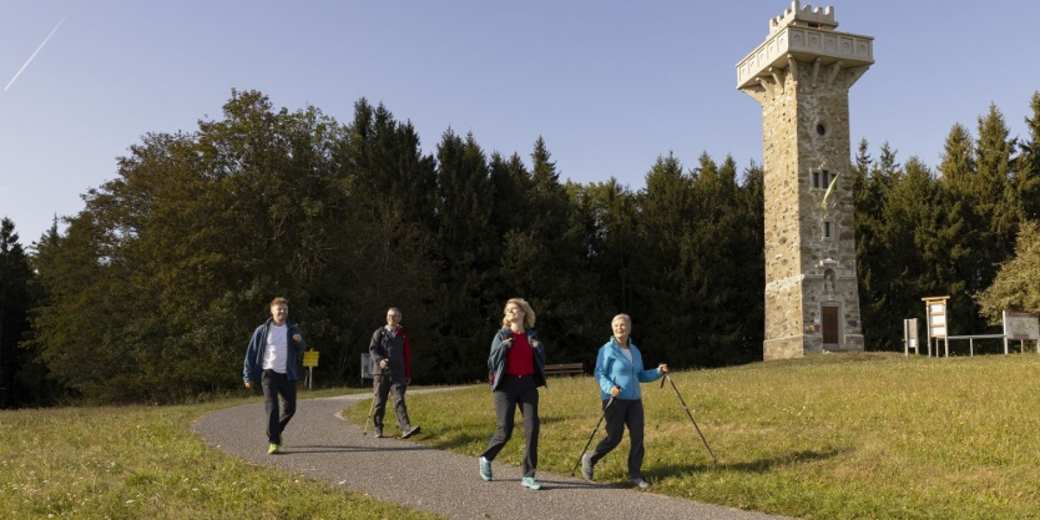 Von Kürnberg aus haben Sie schon die Kaiserin-Elisabeth-Warte am Weistracher Plattenberg auf 750 Metern im Blick. Von hier oben genießen Sie ein beeindruckendes Panorama bis weit in die Alpen hinein. Anschließend führt der Pfad am beliebten Weistracher Mostbrunnen vorbei und hinab zum Hof Magerer, wo Sie links in einen Wiesenweg einbiegen.