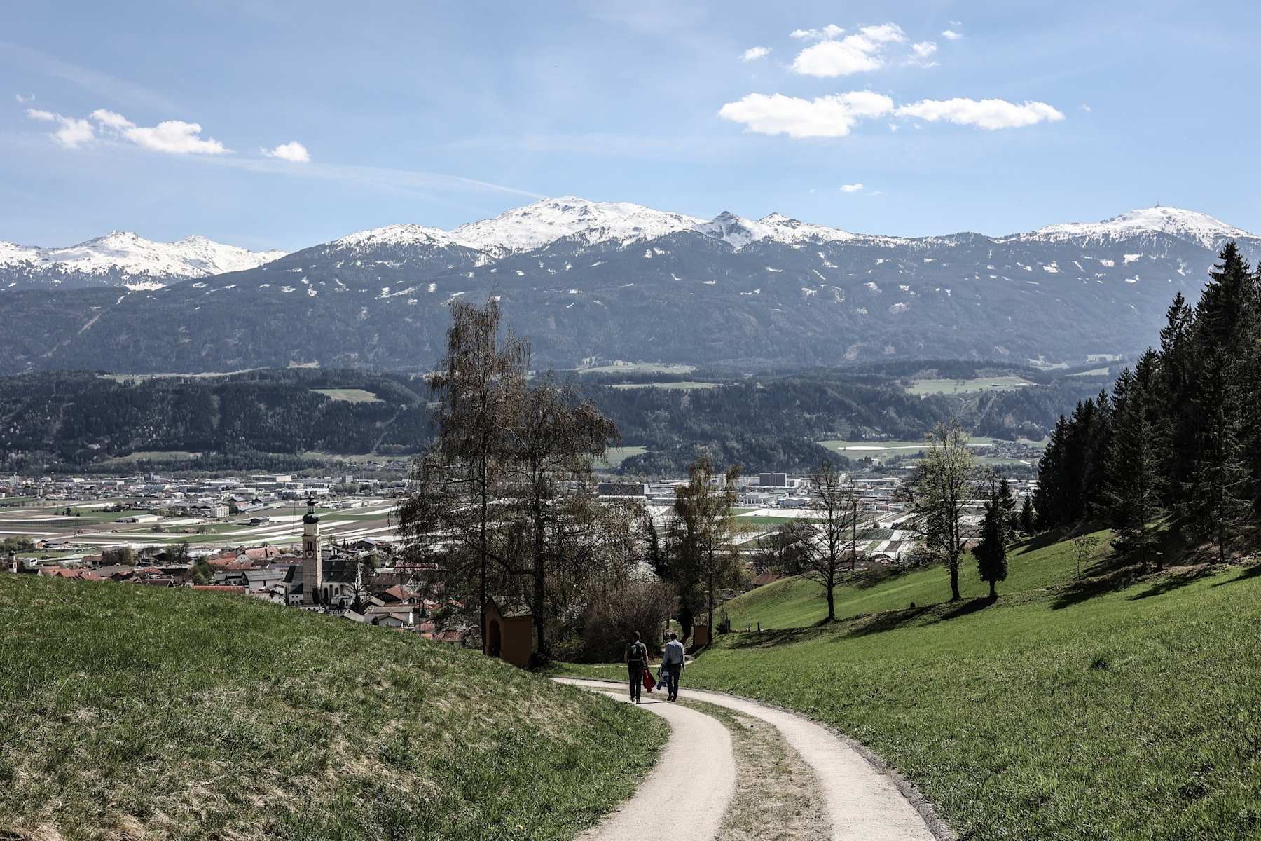 Weiter geht es links hinunter Richtung Sprungschanze. Diesem Weg folgen bis zur Kreuzung mit dem Besinnungsweg (ein Teilstück des Jakobswegs). Dort links in denselben einbiegen und bis nach Gnadenwald weiter – das Ziel der 4. Etappe.