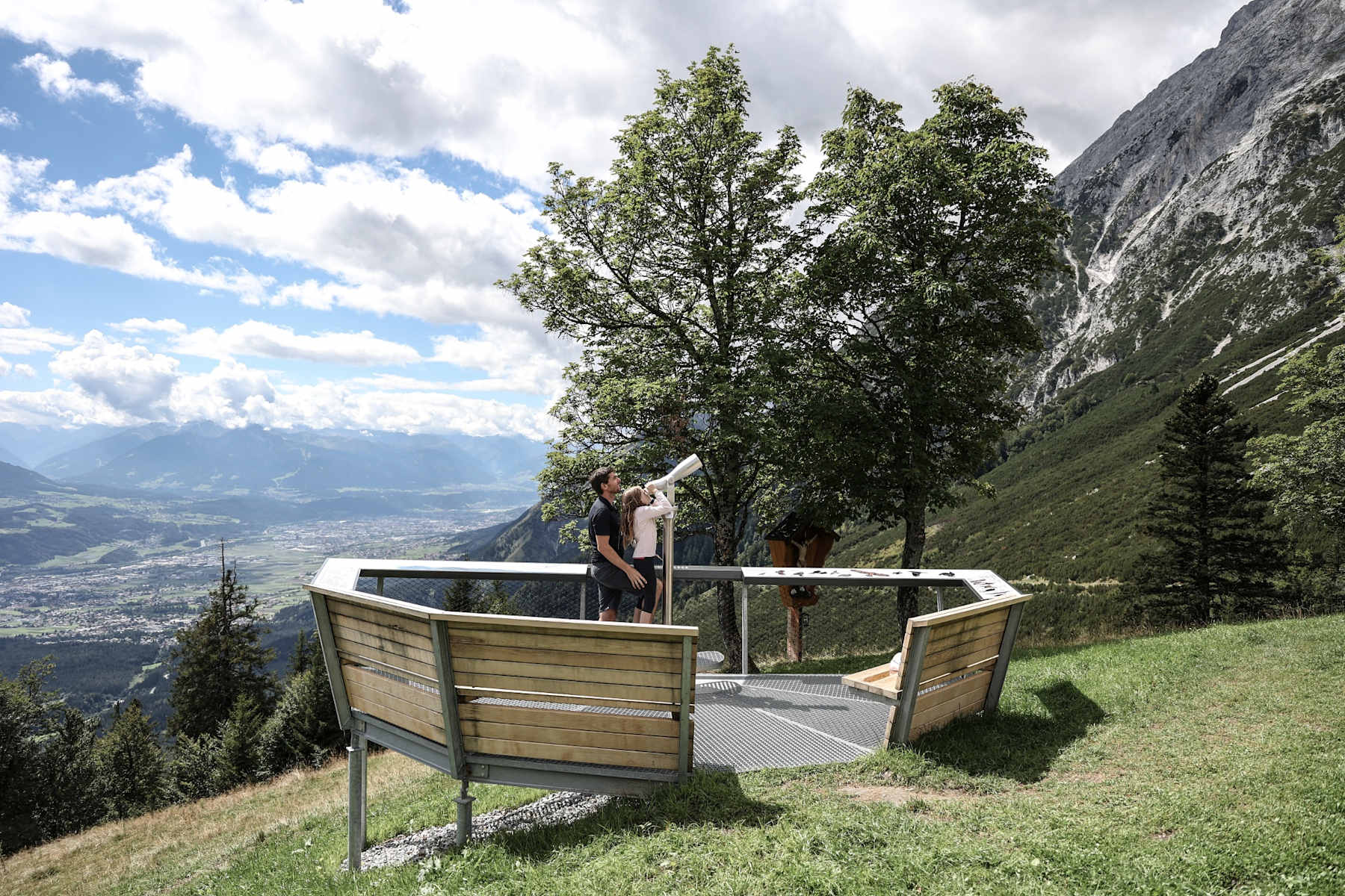 Oben angekommen, kann man auf der Aussichtsplattform Adlerblick 1522 die grandiosen Ausblicke und die Rundumsicht auf die Stubaier Alpen, Tuxer Alpen und das Karwendelgebirge sowie ins Inntal genießen. Die Hinterhornalm lädt zur Rast und Einkehr ein.