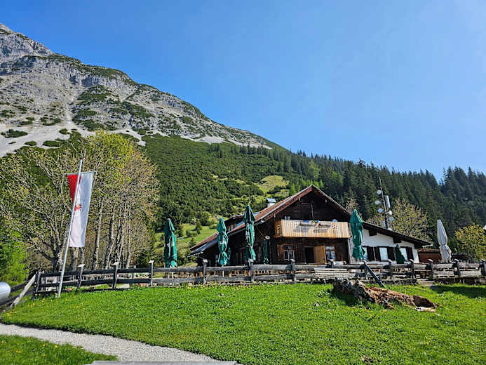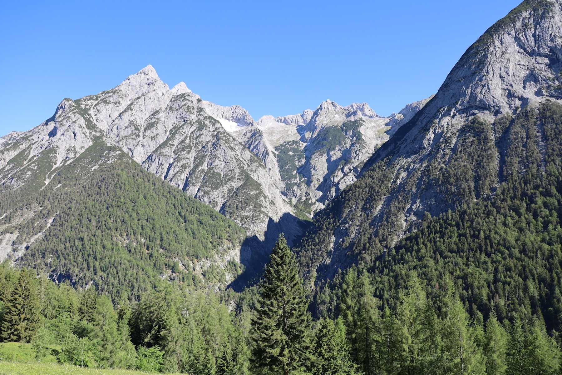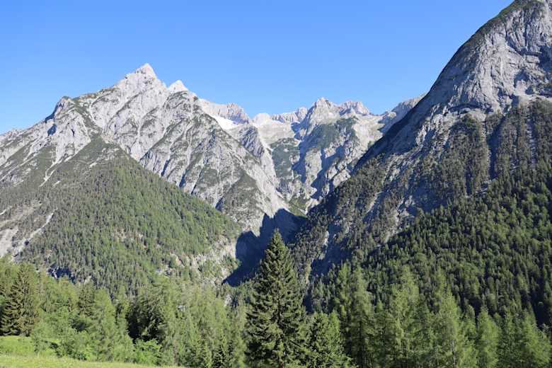 Der Weg führt nun 4 km entlang der Forststraße zur Ganalm hinunter, wo sich atemberaubende Ausblicke ins Karwendel und das Vomperloch bieten.
