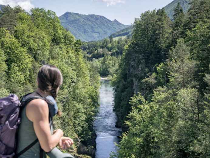 Das Steyr-Ufer wechselnd, taucht man ein in den märchenhaften Wald, der in den Wallfahrtsort Frauenstein führt. Magisch das Licht, das morgens durch die Blätter schimmert. Auf einem Hügel erscheint die Kirche, die mit einer Schutzmantelmadonna auf dem Hochaltar einen Kulturschatz beherbergt. Löst man sich vom himmlischen Ausblick in Frauenstein, geht’s nach Göritz bei Molln, um beim Jugendstilkraftwerk Steyrdurchbruch die Kraft des Wassers zu entdecken.