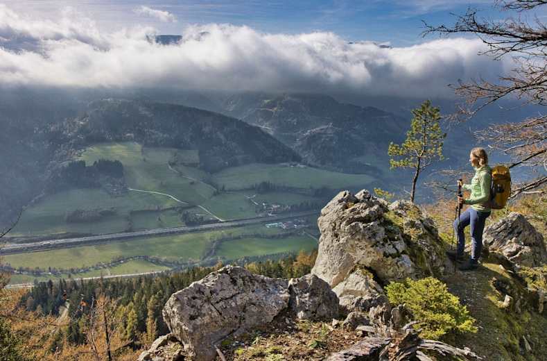 Vom Kloster bzw. dem Zentrum in Mautern (712 m) gehen wir über den Eselsbergweg durch das besiedelte Gebiet bergauf. Entlang von Wiesen- und Waldwegen geht es kontinuierlich bergauf bis zu einem hohen Zaunüberstieg (1.140 m). Wir folgen dem Rittersteig, einem gut begehbaren Weg, der durch steiles, felsiges und bewaldetes Gelände führt.
