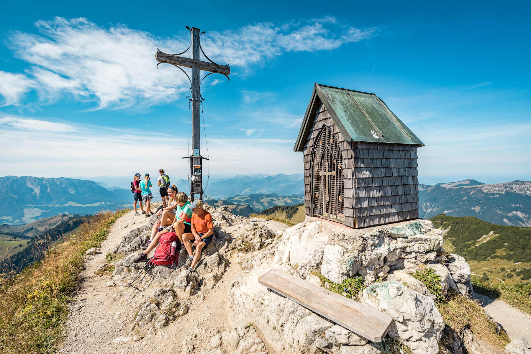 Von der Priener Hütte (1.410 m) wandern Sie in Richtung Norden an der kleinen Bergwachthütte vorbei. Im Anschluss geht es im weiten Bogen über die Hänge des Geigelsteins in den Sattel unterhalb seines Gipfels. Nach ungefähr zehn Minuten stehen Sie am Gipfelkreuz auf 1813 m und somit am höchsten Punkt der gesamten Tour.
