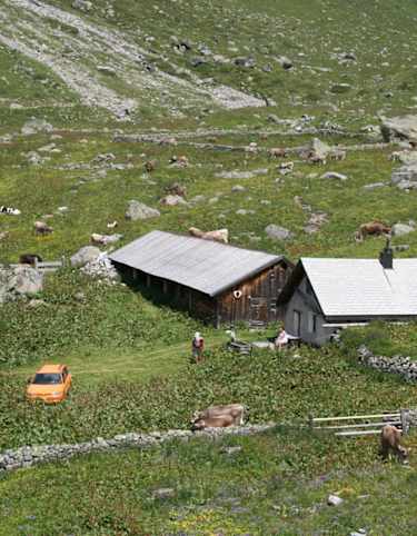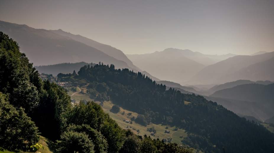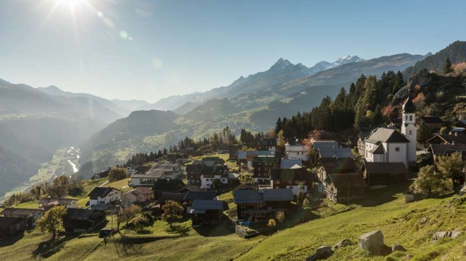 Von Brigels führt die Route über offenes Gelände nach Waltensburg und hinauf ins Bergdorf Andiast. Weiter geht’s durch Waldstücke und über Alpweiden bis nach Siat – mit herrlichem Blick ins Tal und Richtung Ilanz.