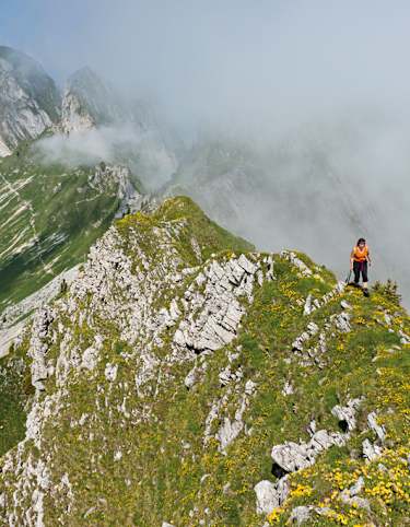 Der Abstieg bietet mehrere Varianten: Entweder steigt man direkt zur Altenalp ab, wo die sanften Alpweiden einen starken Kontrast zum zuvor erlebten Felsgrat bilden, oder man folgt dem Weg Richtung Mesmer, um die Tour mit einer längeren Wanderung zurück zur Ebenalp zu verbinden.