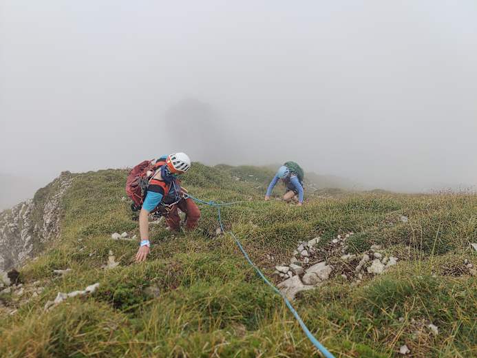 Im Steilgras der Nordflank, die aus dem Altenalpsattel zum östlichen Altenalpturm führt. Foto: Leonie Lindlar