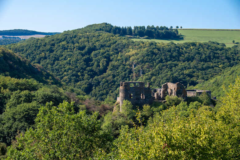 Los geht es durch das Hahnenbachtal, wo wir schon nach kurzer Zeit einen Aussichtspunkt mit schönem Blick auf die Burgruine Schmidtburg erreichen. Weiter geht es zur Keltensiedlung Altburg, an der sich die Wege des Saar-Hunsrück-Steiges und des Soonwaldsteiges wieder trennen. Wir bewandern das Hahnenbachtal noch ein wenig, bevor wir ins Idarbachtal einkehren. Dem Idarbach folgen wir nun bis nach Rhaunen – manchmal etwas entfernt, manchmal direkt am Bach entlang. Im letzten Teil geht es über den Wartenberg, der an einigen Punkten schöne Aussichten auf Rhaunen und Umgebung bietet. Damit ist das Etappenziel erreicht.