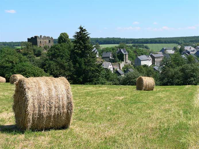 Zwischen Laufersweiler und Niederweiler erleben wir einen stimmungsvollen Wechsel von Wald- und landwirtschaftlich genutzten Wiesenlandschaften. Nach dem Überqueren der L 182 geht es zuerst durch ein Waldgebiet und dann durch idyllische Wiesenlandschaft bis zum mittelalterlichen Örtchen Dill mit seiner imposanten Burgruine und der barocken Dorfkirche.