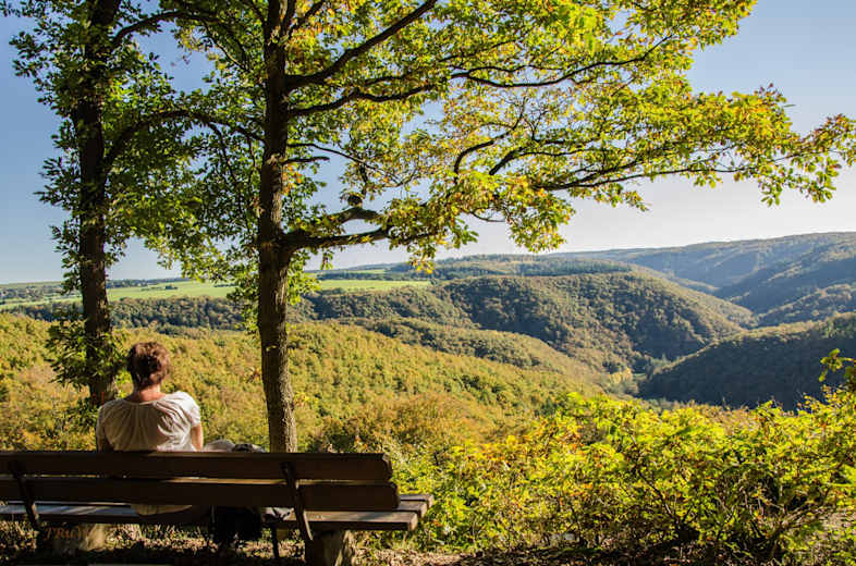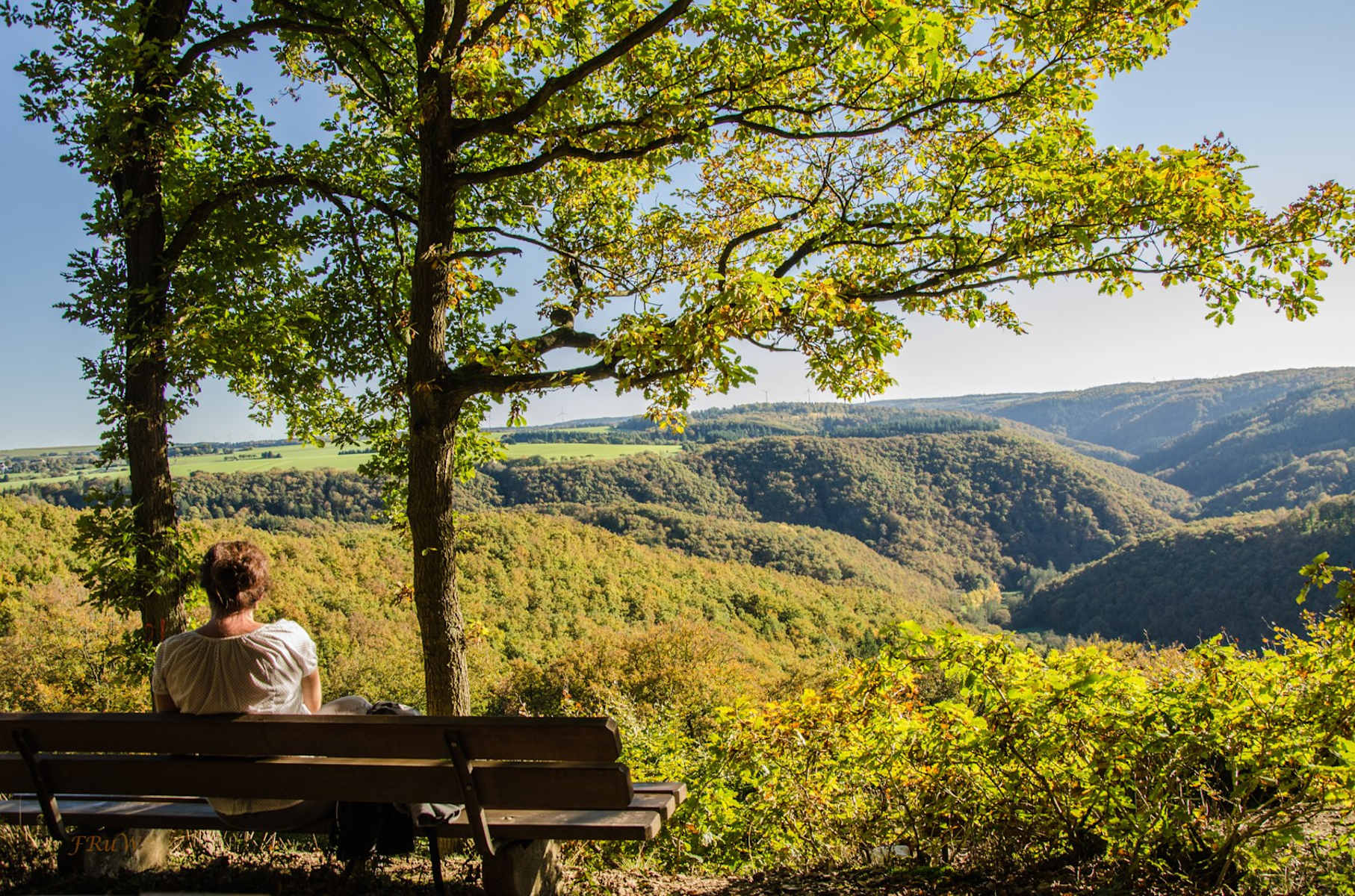 Nun wird es anstrengend, denn es gilt die steile Felsrippe des „Eselsche“ zu erklimmen. Doch oben belohnen uns tolle Aussichten ins Baybachtal. Nach einer kurzweiligen Waldpassage empfängt uns offene Flur und der Blick schweift Richtung Mosel und Eifel, bevor wir das Etappenziel Morshausen erreichen.