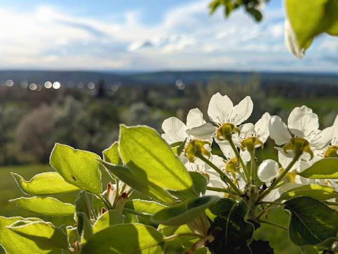 Über „drei Ecken“ verläuft die Route dann inmitten hochstammiger Apfel-, Birnen-, Kirsch- und Walnussbäume verschiedenster Lokalsorten auf Wiesenpfaden hangaufwärts zurück zu den Linden, wo der Parkplatz bereits wieder in Sicht ist.