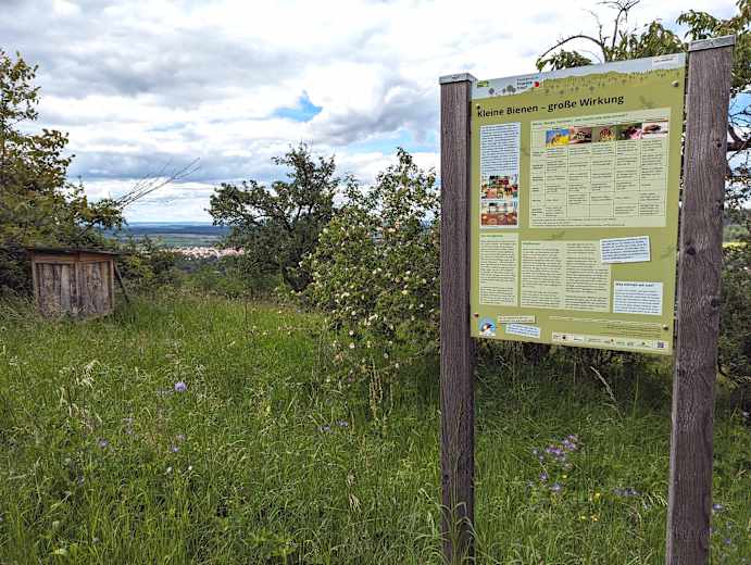 Weitere Tafeln informieren über die Streuobstbäume, deren Pflege und teils alte Sorten. Auch eine weitere Panoramaliege wartet auf uns.